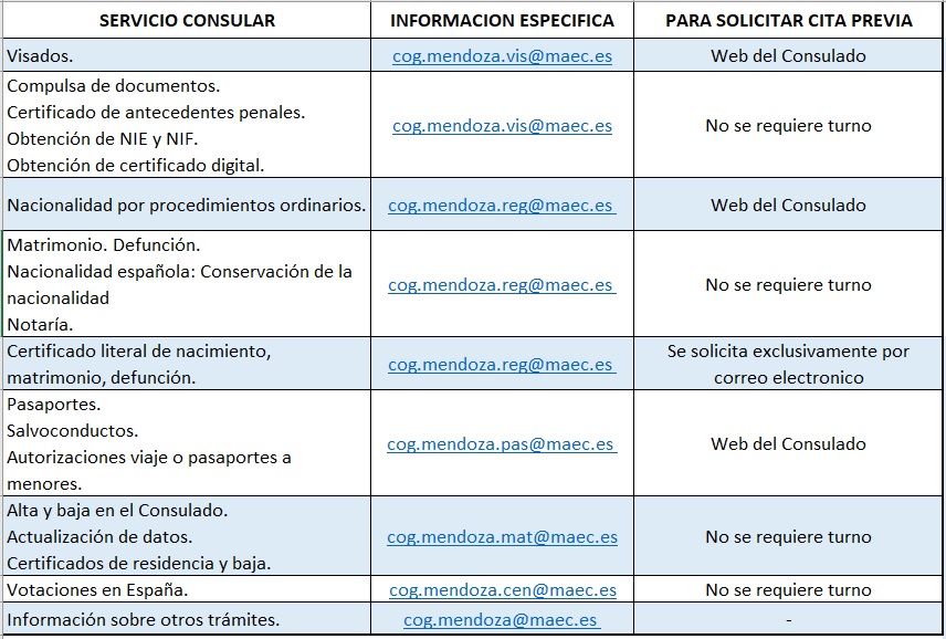 Para realizar consultas por favor dirigirse exclusivamente a cog.mendoza.reg@maec.es