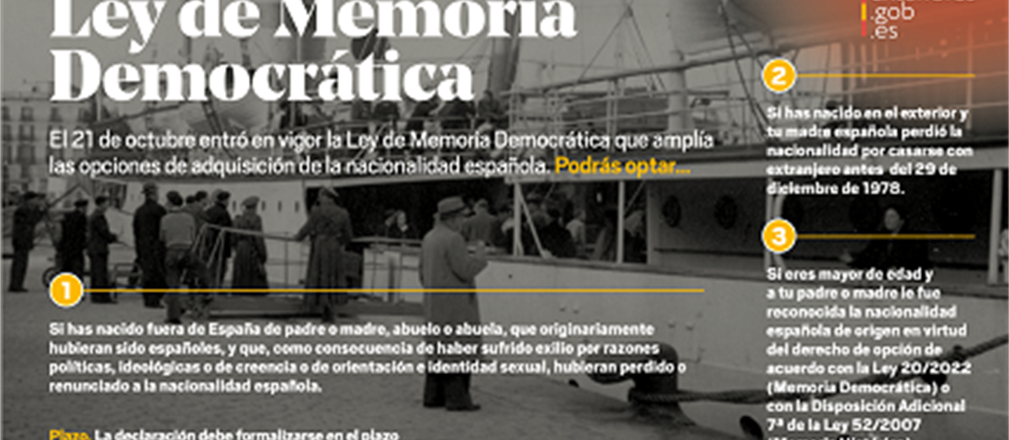 El Consejo de Ministros de 09 de julio de 2024 ha aprobado el Acuerdo de ampliar un año el plazo para ejercer el derecho de optar a la nacionalidad española recogido en la disposición adicional octava de la Ley 20/2022, de 19 de octubre, de Memoria Democrática, que se inició el 21 de octubre de 2022.