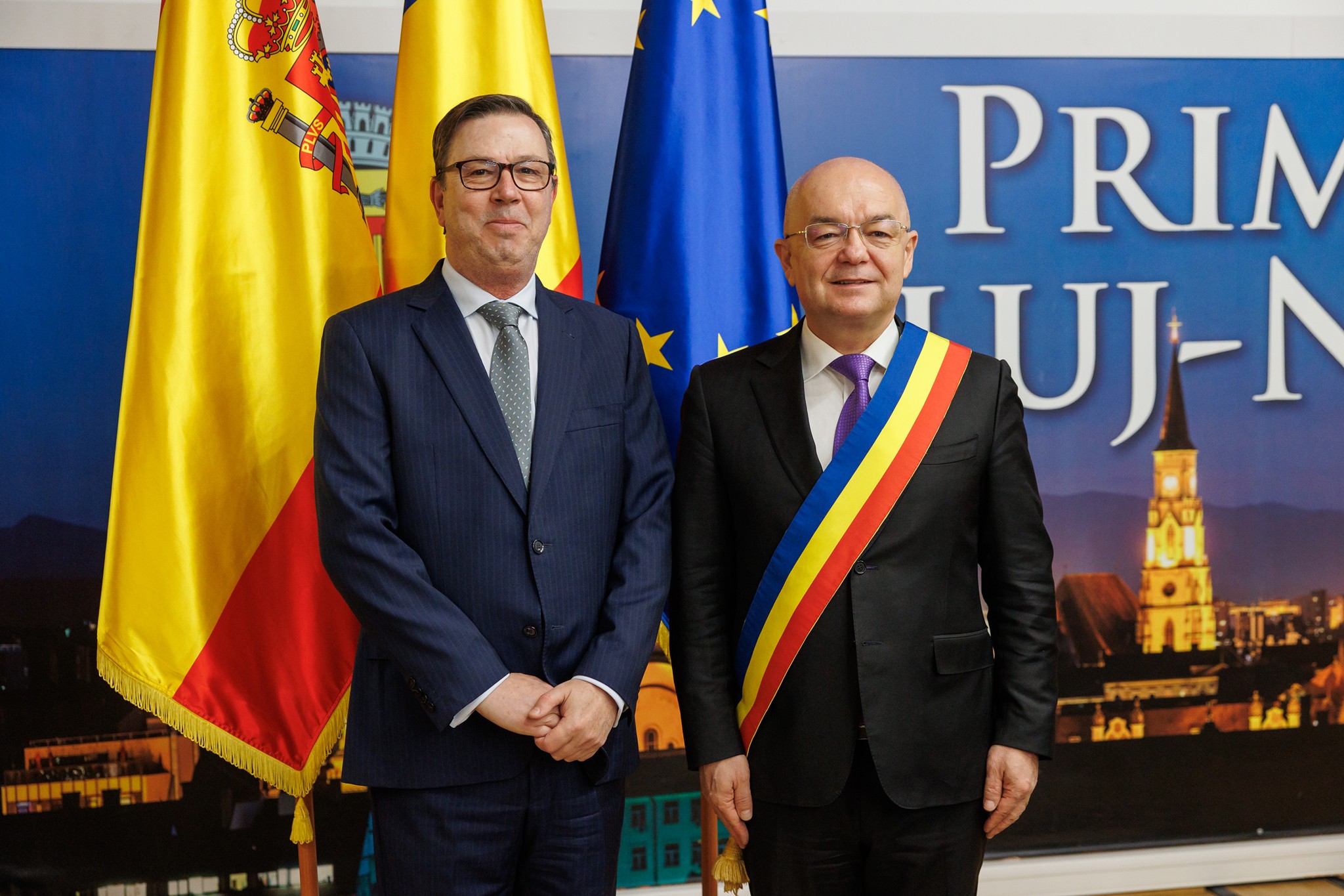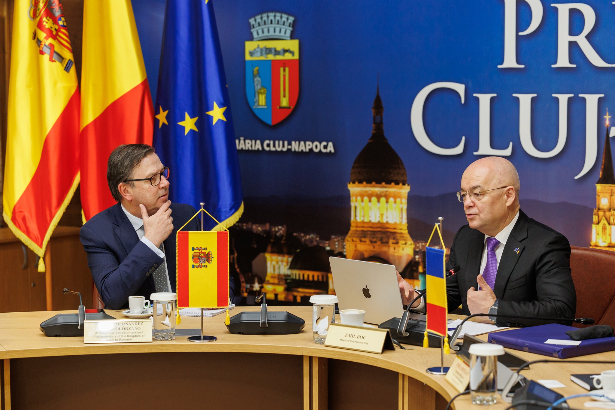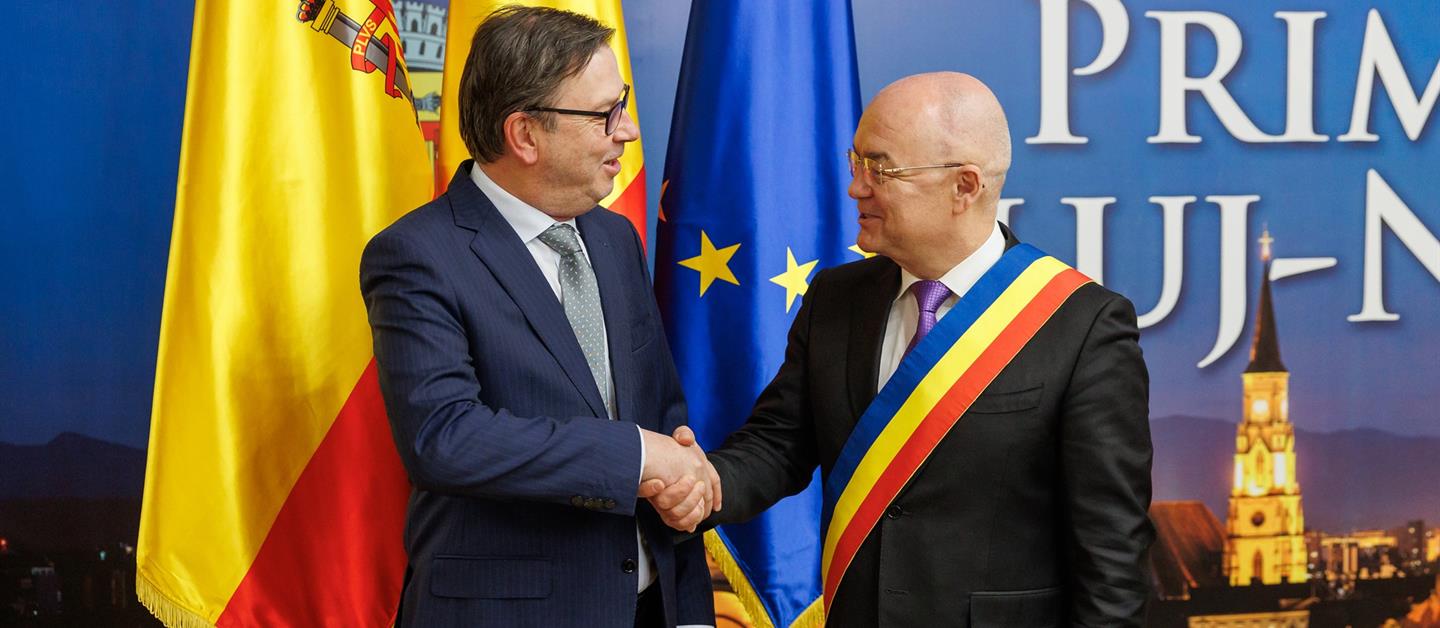 Posteriormente, el Embajador, acompañado por la Consejera Cultural y el Cónsul Honorario, ha mantenido una fructífera reunión con el alcalde de la ciudad de Cluj-Napoca, el. Sr Emil Boc, de cara a seguir avanzando en proyectos de interés común. Ambos han destacado la excelente relación de esta ciudad con municipios de España y han abordado las futuras posibilidades de cooperación. Cabe destacar que la ciudad de Cluj-napoca fue designada en 2021 como ciudad inteligente (“Smart city”) por el Business-Friendly Perception Index de Emerging Europe.