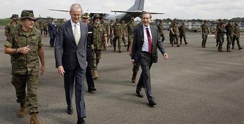 El Ministro, que iba acompañado del Jefe del Estado Mayor de la Defensa, Almirante Fernando García Sánchez, fue recibido en Libreville y acompañado en su visita al destacamento aéreo "Mamba", por el Embajador de España en Gabón y el personal diplomático de la Embajada.