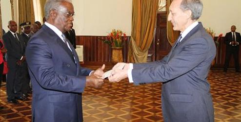 El pasado 5 de mayo Don Enrique Asorey Brey presentó al Presidente de la República Democrática de Santo Tomé y Príncipe, Manuel Pinto Da Costa, las Cartas Credenciales que le acreditan como nuevo Embajador de España en Santo Tomé y Príncipe.
