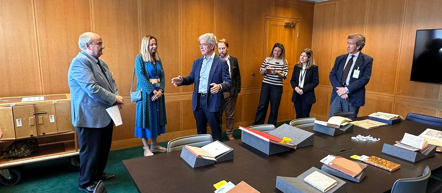 Accompanied by the Councillor for Cultural Affairs and the Director of the Cervantes Institute, José Pascual Marco was received by Richard Davies, the Chief of Staff. Mr Davies spoke to the group about the institution's history and showed them the Spanish-language collection, which includes manuscripts and first editions of Spanish and Latin American documents.