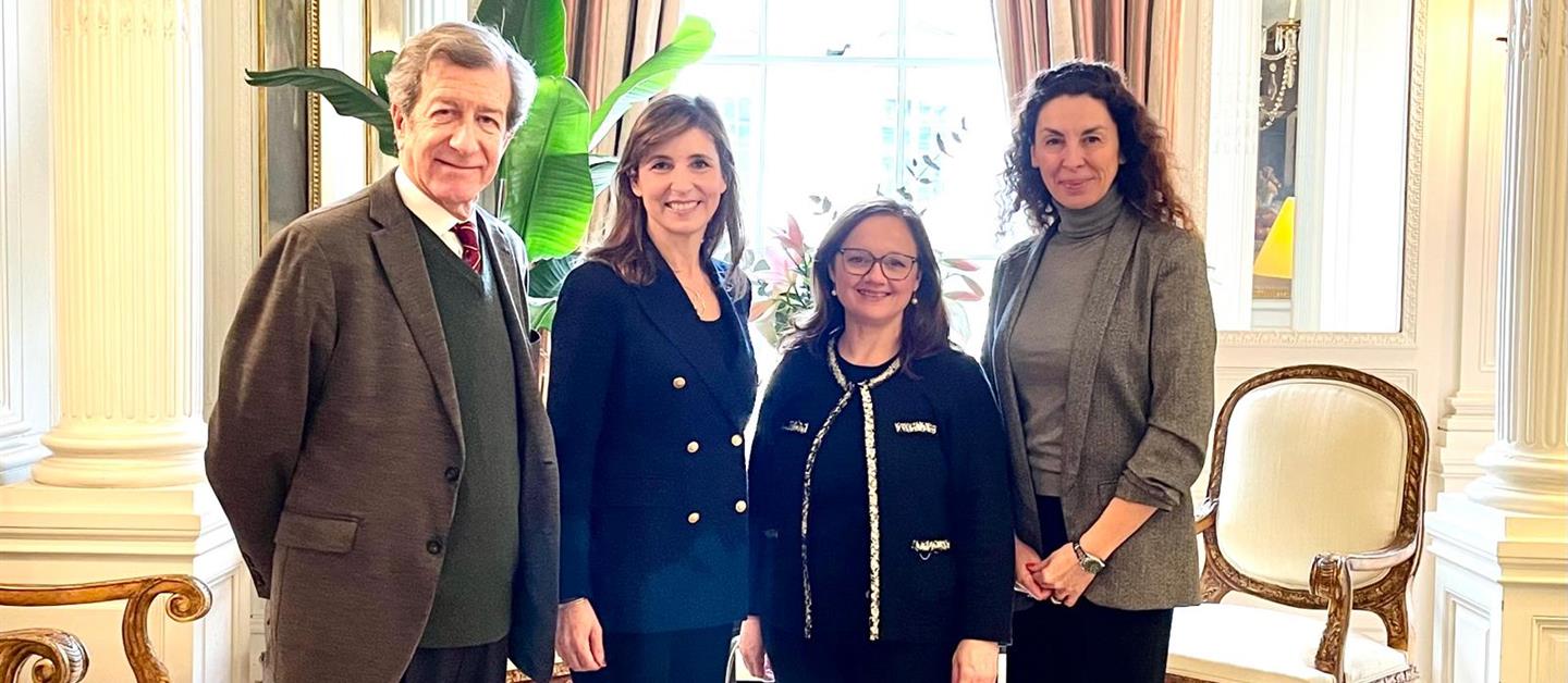 La embajadora Aparici conoció el trabajo de CRIS Cáncer, que colabora en la investigación contra el cáncer en centros en España, Reino Unido y Francia. Lola Manterola, fundadora de la asociación, y Marta Brime, presidenta de la división británica, informaron de los proyectos y últimos avances, en particular el logro del doctor Mariano Barbacid y su equipo, que han eliminado por completo tumores de páncreas en ratones.