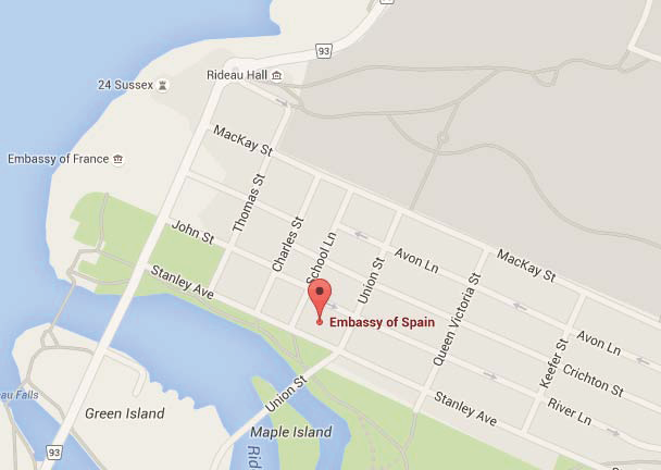 74 Stanley Avenue.- Ottawa (Ontario), K1M 1P4.Teléfonos: (613) 747-2252, 747-7293, 747-1143 y 747-6181Fax: (613) 744-1224Email: emb.ottawa@maec.es