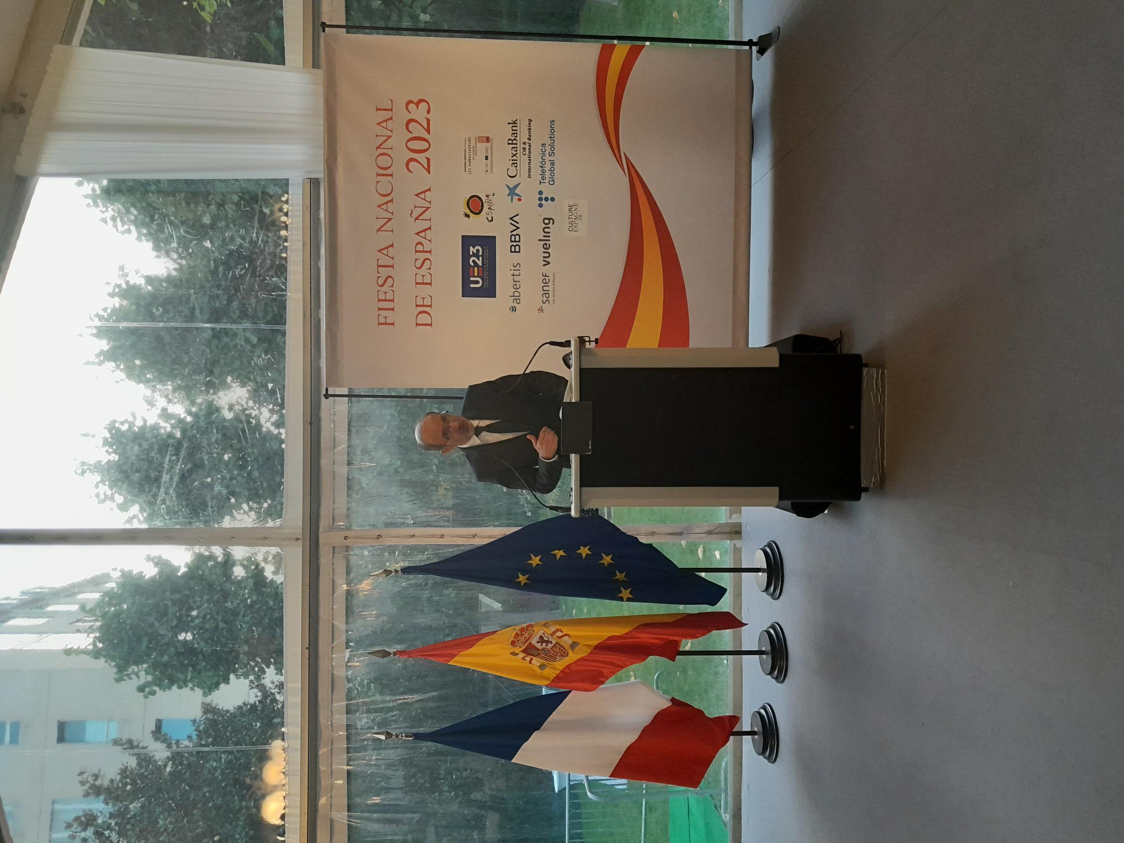 Ante los invitados congregados para la recepción, el Embajador de España, D. Victorio Redondo, ha subrayado los extraordinarios vínculos que unen a nuestros dos países y ha repasado los principales hitos que han jalonado este pasado año. En 2023, ha destacado la celebración en enero de la Cumbre de Barcelona, donde los Presidentes Macron y Sánchez firmaron el Tratado de Amistad y Cooperación, que vertebra y canaliza una cooperación reforzada entre España y Francia en todos los ámbitos que componen nuestra relación: concertación europea; política exterior, de seguridad y defensa; justicia y asuntos de interior; cultura, educación, enseñanza superior, ciencia, juventud y deportes; economía, industria, conectividad y turismo; desarrollo sostenible, energía, transportes, agricultura y alimentación; sanidad, trabajo y asuntos sociales; y la cooperación transfronteriza.