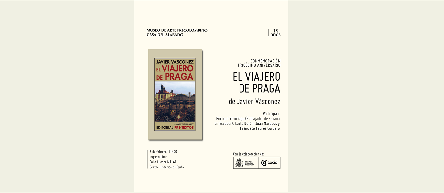 El pasado sábado 7 de febrero, con el apoyo de esta Embajada, el Museo de Arte Precolombino Casa del Alabado fue escenario de un emotivo evento cultural para conmemorar los 30 años de la publicación, por la editorial española Alfaguara, de la emblemática novela El viajero de Praga, del reconocido escritor ecuatoriano Javier Vásconez.