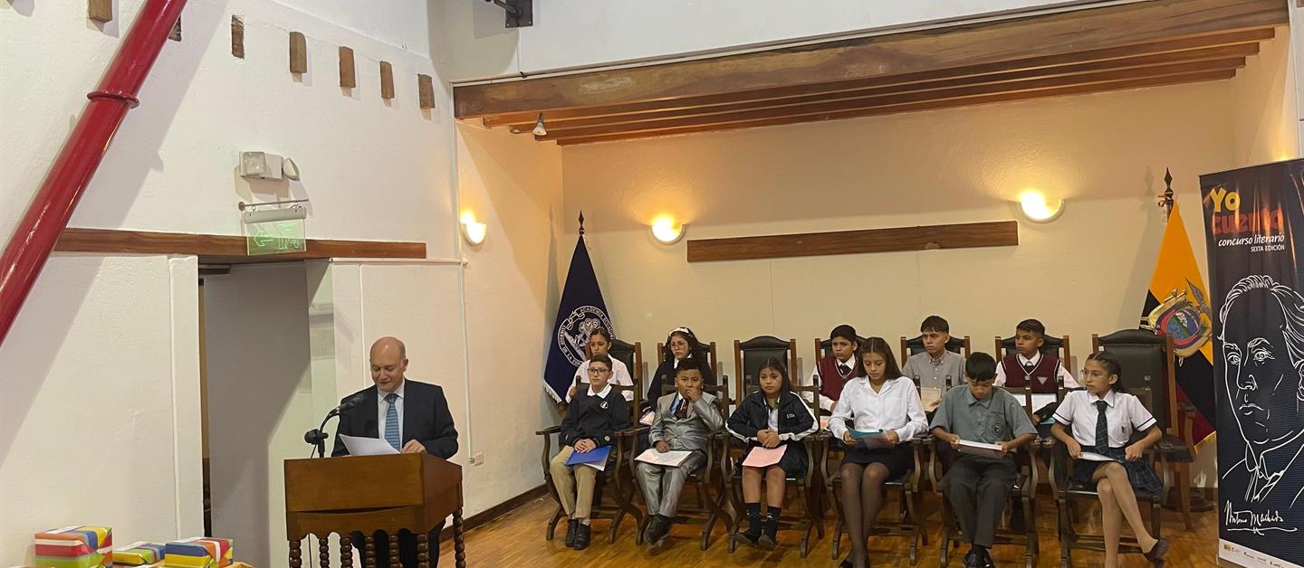 El pasado 18 de noviembre, el Embajador de España en Ecuador, Enrique Yturriaga, presidió la ceremonia de entrega de premios de la VI edición del concurso literario infantil y juvenil “Yo cuento", que puso el broche final a la última fase de un proceso que la Embajada, junto con la Academia Ecuatoriana de la Lengua, el Ministerio de Educación, Deporte y Cultura, la Editorial Santillana–Loqueleo y la Fundación Chulpicine, inició en abril de 2025, con la convocatoria dirigida a estudiantes de entre 8 y 14 años de todo el país.