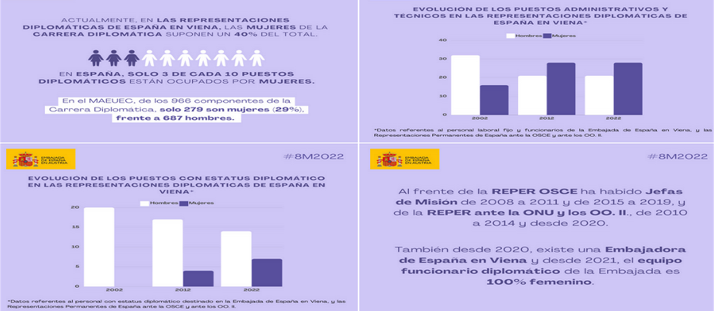 Con motivo del pasado 8 de marzo, Día Internacional de la Mujer, la Embajada de España en Viena ha elaborado una serie de creatividades que muestran datos de los últimos 20 años sobre la presencia de mujeres en las Representaciones españolas en Viena, agrupados en bloques de 10 años.