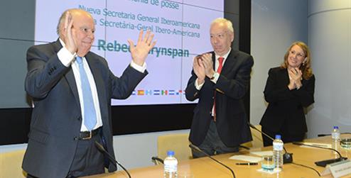 José Manuel García-Margallo ha acompañado a Rebeca Grynspan en su primera actividad en Madrid al frente de la SEGIB. El acto ha sido presidido por su antecesor, Enrique Iglesias, y ha contado con la presencia del secretario de Estado Jesús Gracia