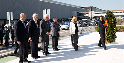 José Manuel García-Margallo, acompañado de su homólogo francés, Laurent Fabius, y alemán, Frank-Walter Steinmeier, han participado en el acto de homenaje en el que se ha depositado una corona de flores frente al mosaico de Joan Miró en la terminal 2 del aeropuerto de El Prat. En la ofrenda han estado acompañados por el alcalde de El Prat de Llobregat, Lluís Tejedor Ballesteros, y la vicepresidenta de la Generalitat, Joana Ortega.