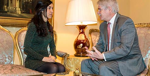 Nadia Murad, joven yazidí de origen iraquí que fue víctima de esclavitud sexual a manos de los terroristas del DAESH, contribuye a dar voz y visibilidad a las víctimas del terrorismo en Oriente Medio. En su encuentro con Alfonso Dastis, se destacó la necesidad de proteger a las minorías y a los más vulnerables, fortaleciendo los marcos jurídicos y de defensa internacional, y haciendo de las ciudades zonas más seguras, de paz y libertad. El ministro Alfonso Dastis y Nadia Murad coincidieron en la necesidad de crear entornos seguros y condiciones de vida dignas para el regreso de los desplazados.