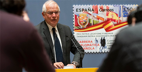 El sello muestra el emblema y el lema de la Carrera Diplomática: “Pro Patria legatione fungimur, tamquam Patria exhortante per nos. “Somos Embajadores de la Patria de tal forma que la Patria os habla a través de nosotros”.