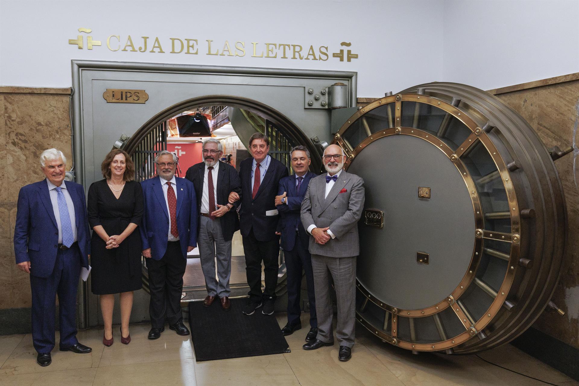 Le directeur de l'Institut Cervantes, Luis Garcia Montero, et la directrice générale, Carmen Noguero, avec les enfants du philologue et professeur Manuel Alvar lors de la remise de son héritage à la Caja de las Letras à l'Institut Cervantes de Madrid. EFE