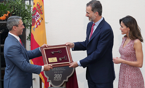 En San Antonio, el domingo 17 de junio, Sus Majestades los Reyes fueron recibidos por el alcalde de la Ciudad y los miembros de la corporación municipal. Ya en la Misión de San José, visitaron la iglesia, el granero y el sistema de acequias donde saludaron a un grupo de estudiantes de la organización “SOS Spain Ambassadors” que viajarán próximamente a España con motivo del tricentenario. Más tarde, inauguraron la exposición "Diseñando América", organizada por la Fundación Consejo España-EE.UU., y otra muestra en el Museo de Arte que reúne a un elenco de obras procedentes de varias pinacotecas madrileñas de autores como Velázquez, Goya, el Greco, Murillo, Sorolla y Picasso. Posteriormente, Su Majestad el Rey mantuvo un encuentro con el gobernador de Texas, Greg Abbott, y recibió en audiencia a historiadores norteamericanos y presidentes de las principales universidades de la ciudad. A última hora, Sus Majestades los Reyes asistieron en el centro Pearl Stable, a la cena oficial en su honor de la Ciudad de San Antonio. Allí, Don Felipe pronunció un discurso en el que animó a reforzar los lazos entre España y Estados Unidos en los ámbitos educativo, cultural, empresarial y comercial.