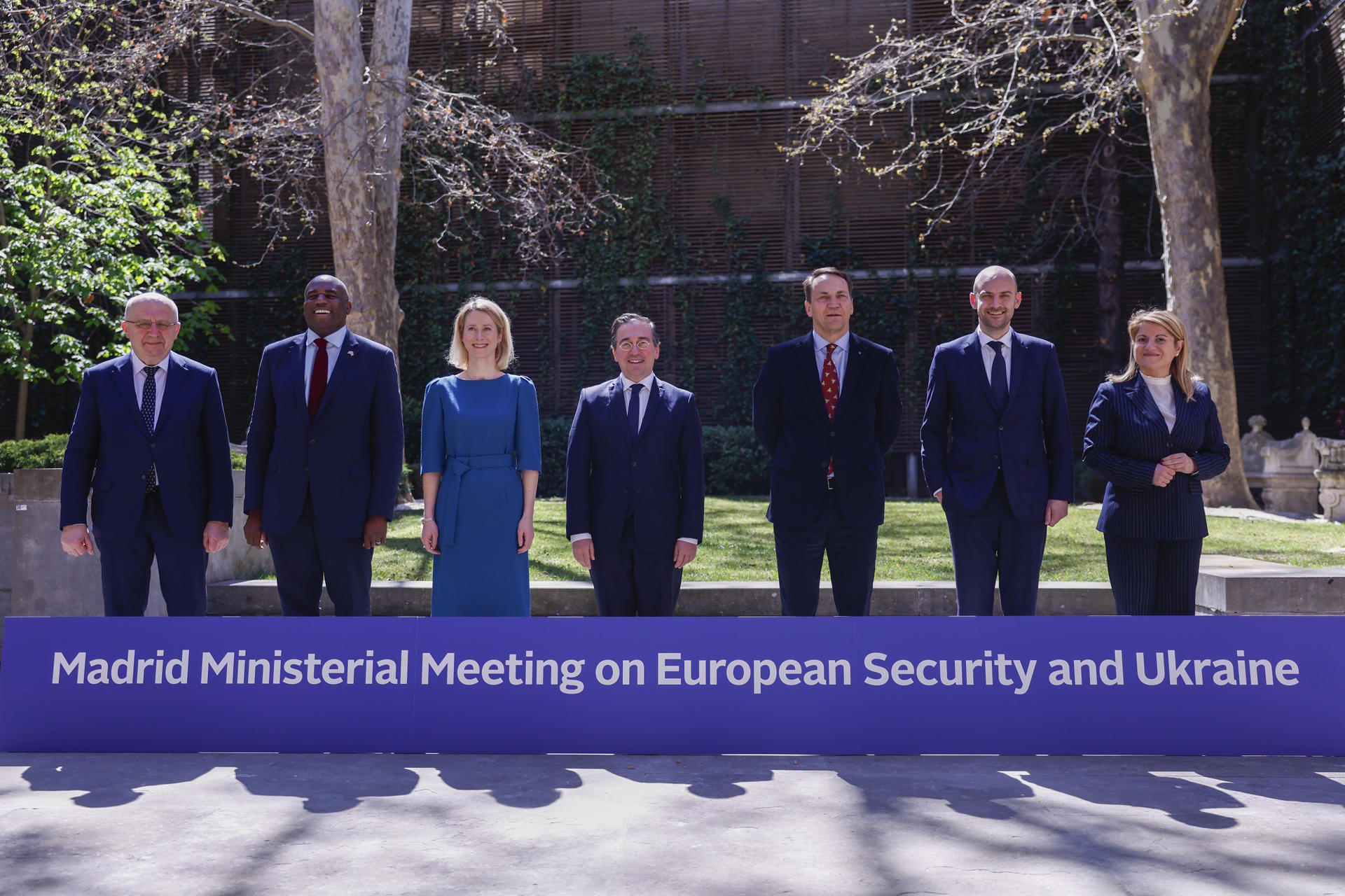 O ministro Albares, a Alta Representante da Unión Europea para Asuntos Exteriores e vicepresidenta na Comisión Europea, o comisario europeo de Defensa e os ministros de Exteriores de Gran Bretaña, Polonia, Francia e Alemaña na reunión sobre seguridade europea e Ucraína celebrada en Madrid. EFE