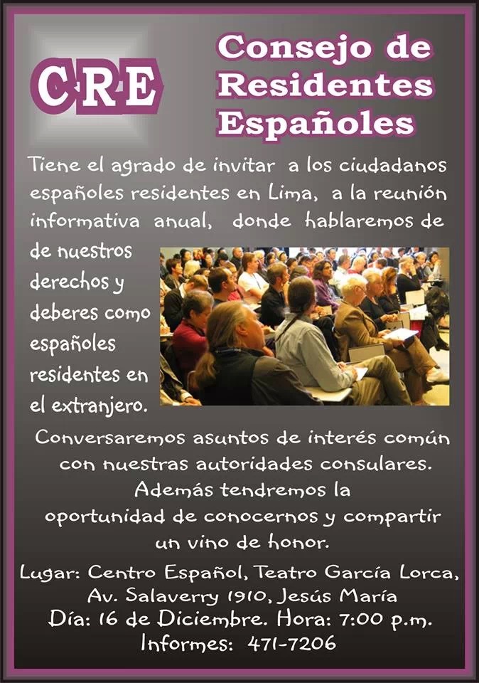 Ayer por la tarde tuvo lugar en el teatro del Centro Español una reunión abierta del Consejo de Residentes Españoles (CRE) de Perú con la colectividad española residente en el país.