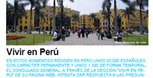 El Consulado General de España en Lima ha publicado el tercer número de su Boletín informativo InfoPerú, dirigido a la colectividad española residente en Perú. El Boletín tiene como principales objetivos dar a conocer periódicamente a los ciudadanos españoles que residen en Perú las actividades del Consulado, además de ofrecerles informaciones prácticas sobre trámites consulares. El Boletín se ha remitido por correo electrónico a todos los ciudadanos españoles inscritos en el Registro de Matrícula Consular que facilitaron su dirección al inscribirse.