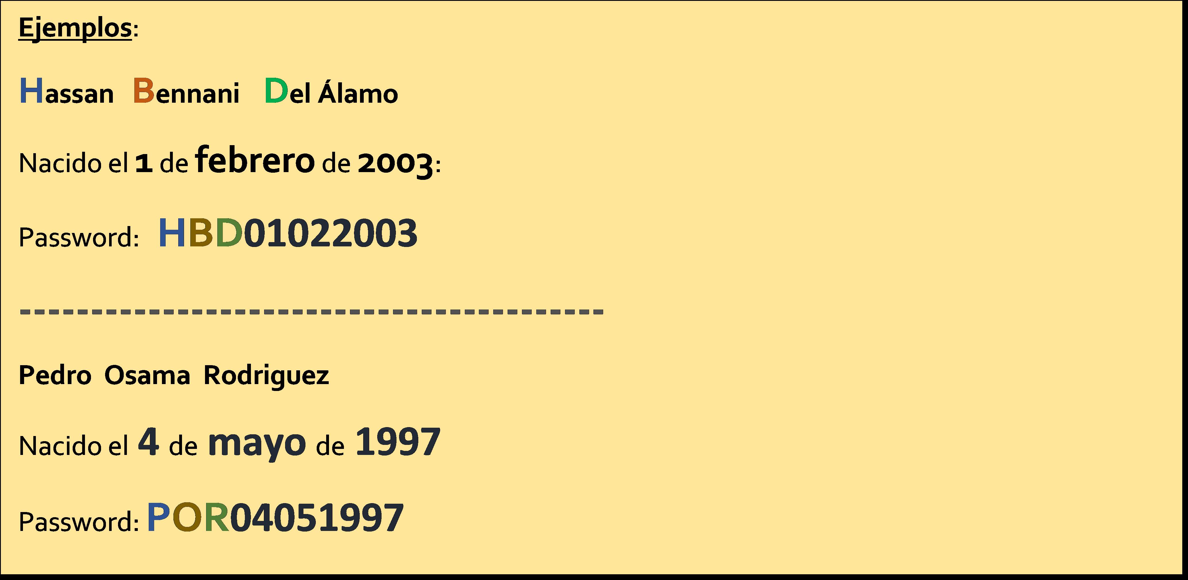 La contraseña será, siempre en mayúsculas, la primera letra de su primer nombre, la primera letra que conforme su primer apellido y la primera letra que conforme su segundo apellido, seguidas de su fecha de nacimiento en formato de OCHO dígitos: dos para el día, dos para el mes y cuatro para el año, sin utilizar guiones ni separadores. ejemplo
