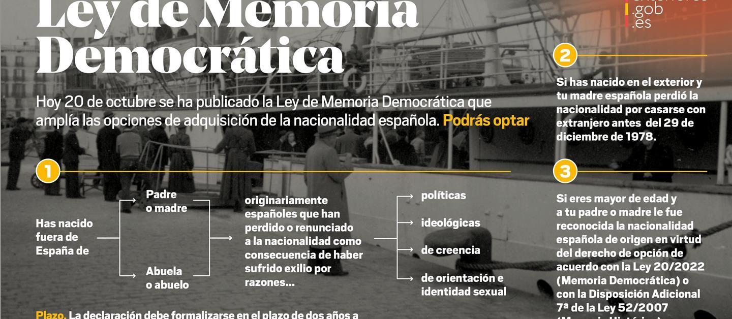 La Ley 20/2022, de 19 de octubre, de Memoria Democrática (BOE de 20 de octubre) establece, en su disposición adicional octava, la posibilidad de adquirir la nacionalidad española para: