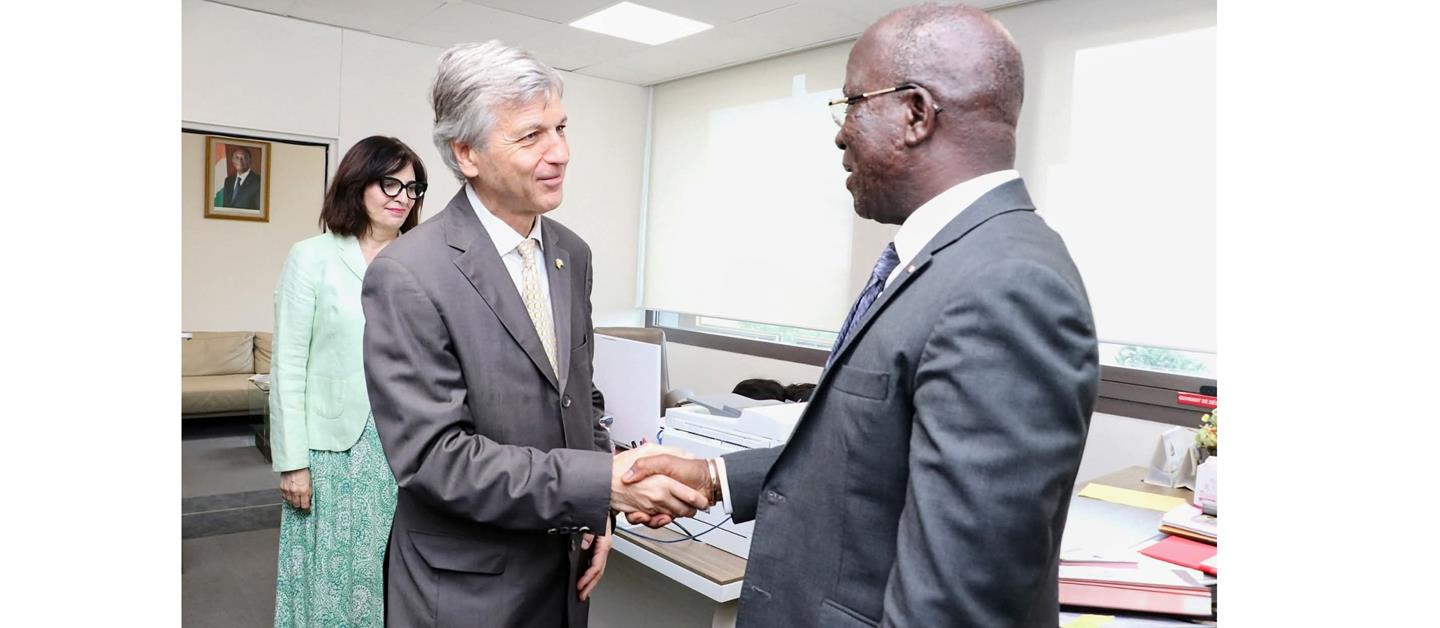 El pasado 9 de julio, el Embajador de España, D. Guillermo Marín Gorbea, se reunió con el Ministro de Medio Ambiente, Desarrollo Sostenible y Transición Ecológica de Costa de Marfil, D. Jacques Assahoré Konan. El encuentro permitió repasar las prioridades compartidas en materia de protección medioambiental, lucha contra el cambio climático y conservación de los ecosistemas costeros, ámbitos en los que España mantiene una cooperación activa con Costa de Marfil, tanto a través de proyectos bilaterales como en colaboración con organismos multilaterales.