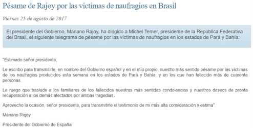 El presidente del Gobierno, Mariano Rajoy, ha enviado un telegrama de pésame por las víctimas de los naufragios en los estados de Pará y Bahía al presidente de la República Federativa de Brasil, Michel Temer.