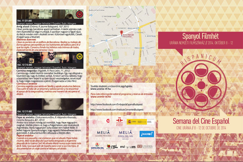 Esta Semana del Cine Español de Budapest está organizada por la Embajada de España y el Instituto Cervantes de Budapest junto al Cine Urania y con el apoyo de la Dirección General de Política e Industrias Culturales y del Libro de la Secretaría de Estado de Cultura, la Filmoteca de la Agencia Española de Cooperación Internacional al Desarrollo (AECID), el Instituto de Cinematografía y de Artes Audiovisuales (ICAA) así como la Oficina de Tourespaña en Viena.