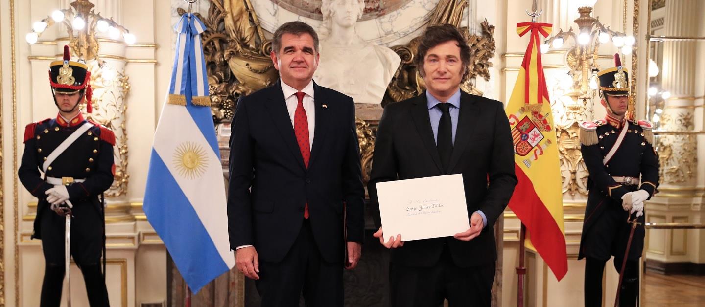 ​El miércoles 17 de diciembre el embajador Joaquín María de Arístegui presentó las cartas credenciales al Presidente de la República Argentina, Javier Gerardo Milei, en la Casa Rosada. Tras la entrega, se procedió a la habitual ofrenda floral ante la estatua del general San Martín, acompañado por parte del equipo de la Embajada.