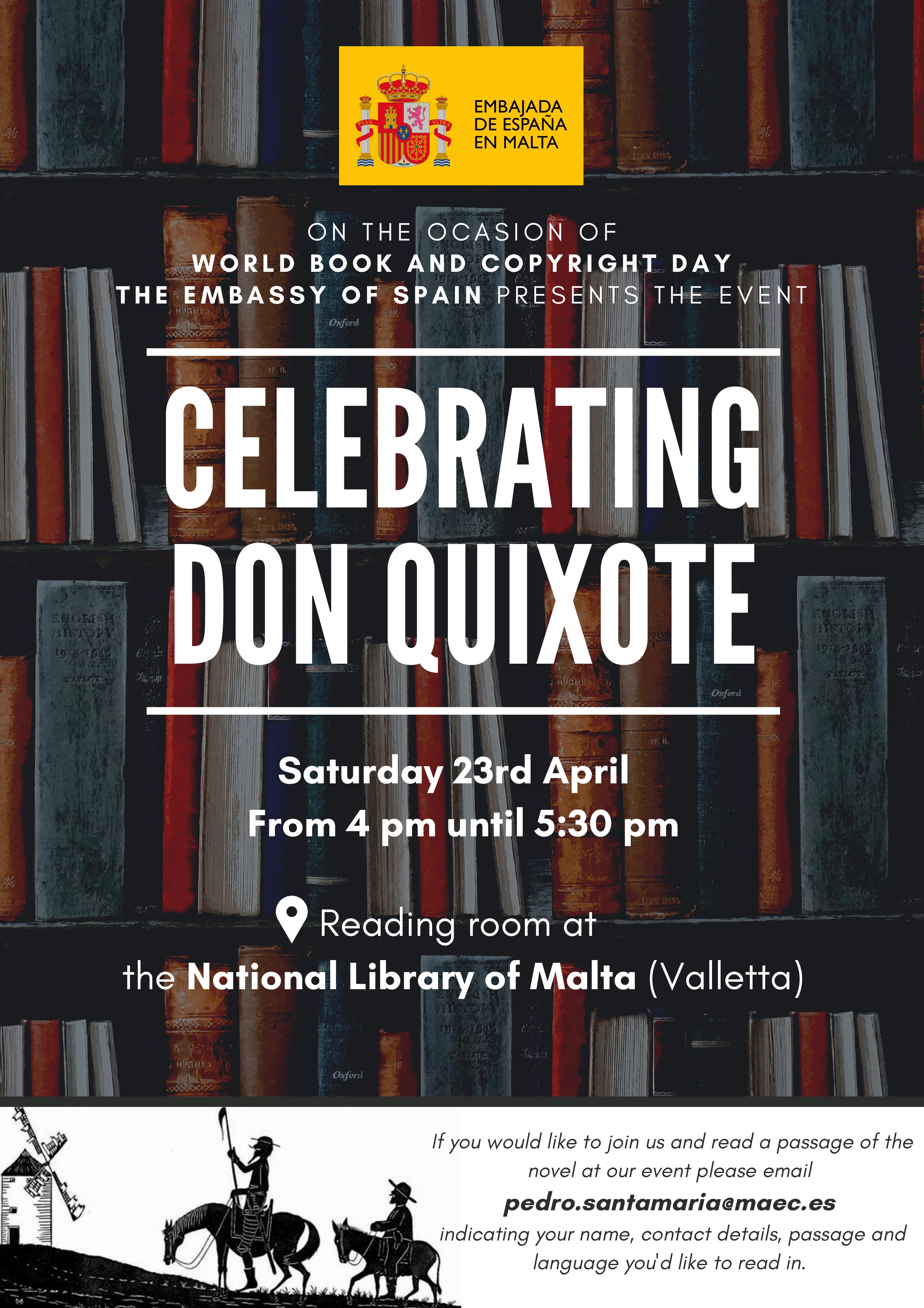 Con ocasión del Día Mundial del Libro (23 de abril), estaremos leyendo pasajes de Don Quijote. Si quiere unirse, déjenos el pasaje que le gustaría leer y el idioma en el que le gustaría hacerlo. Si solo desea asistir, ¡escríbanos!
