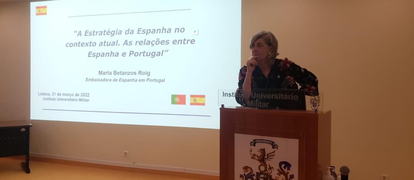 La Embajadora de España en Portugal, Marta Betanzos, acudió en la mañana de hoy al Instituto Universitario Militar (IUM), que desarrolla actividades de enseñanza y capacitación de oficiales de la FFAA y de la GNR. Invitada a participar en el Curso de Promoción de Oficiales Generales (CPOG) 2021/2022, dirigió su intervención a 35 alumnos, de los que 33 pertenecen a las Fuerzas Armadas Portuguesas (12 del Ejército, 8 de la Armada, 6 de la Fuerza Aérea y 7 de la Guardia Nacional Republicana), y 2 a las Fuerzas Armadas de Brasil (1 de la Armada y 1 del Ejército). El objetivo del curso es proporcionarles las habilidades adecuadas para el desempeño y ejercicio de las funciones de mando, gestión, liderazgo y personal.
