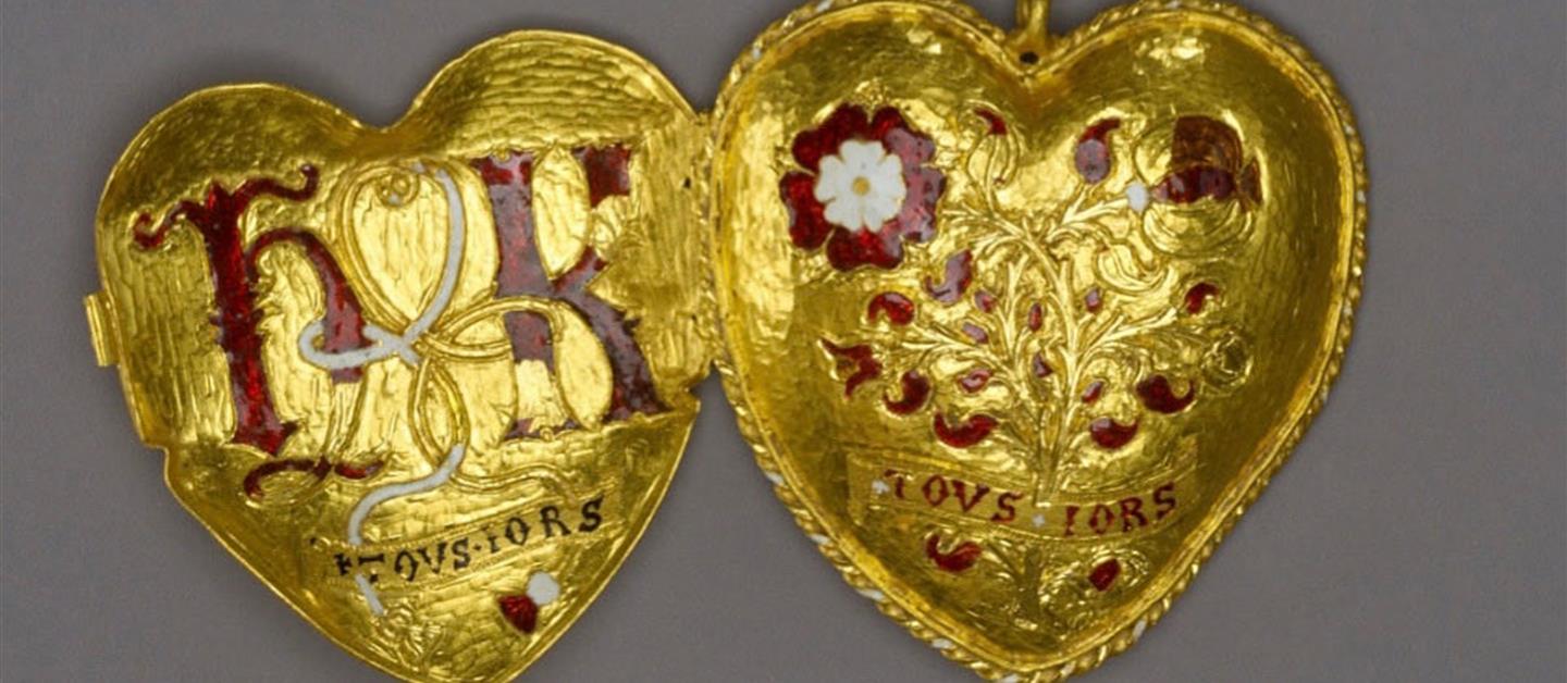 The Tudor Heart, found by a metal detectorist in Warwickshire in 2019, is a heart-shaped gold pendant with enamelled motifs, attached to a 75-link gold chain by a hand-shaped clasp. On the front, a white and red Tudor rose entwined with a pomegranate tree, the emblem of Catherine of Aragon, representing fertility and her Spanish homeland, can be seen. Below is a banner with the word "toujours," which means "always" in French.