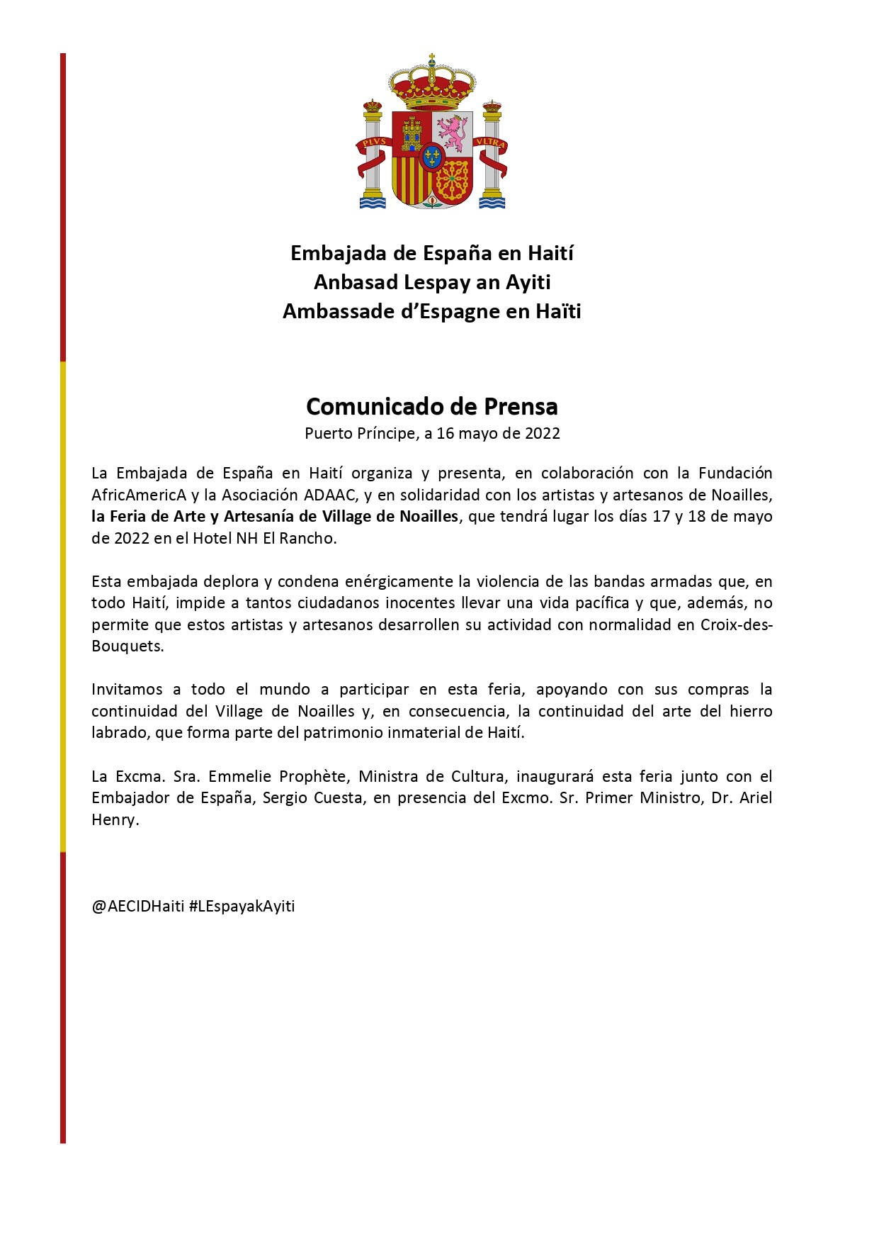 La Embajada de España en Haití organiza y presenta, en colaboración con la Fundación AfricAmericA y la Asociación ADAAC, y en solidaridad con los artistas y artesanos de Noailles, la Feria de Arte y Artesanía de Village de Noailles, que tendrá lugar los días 17 y 18 de mayo de 2022 en el Hotel NH El Rancho.