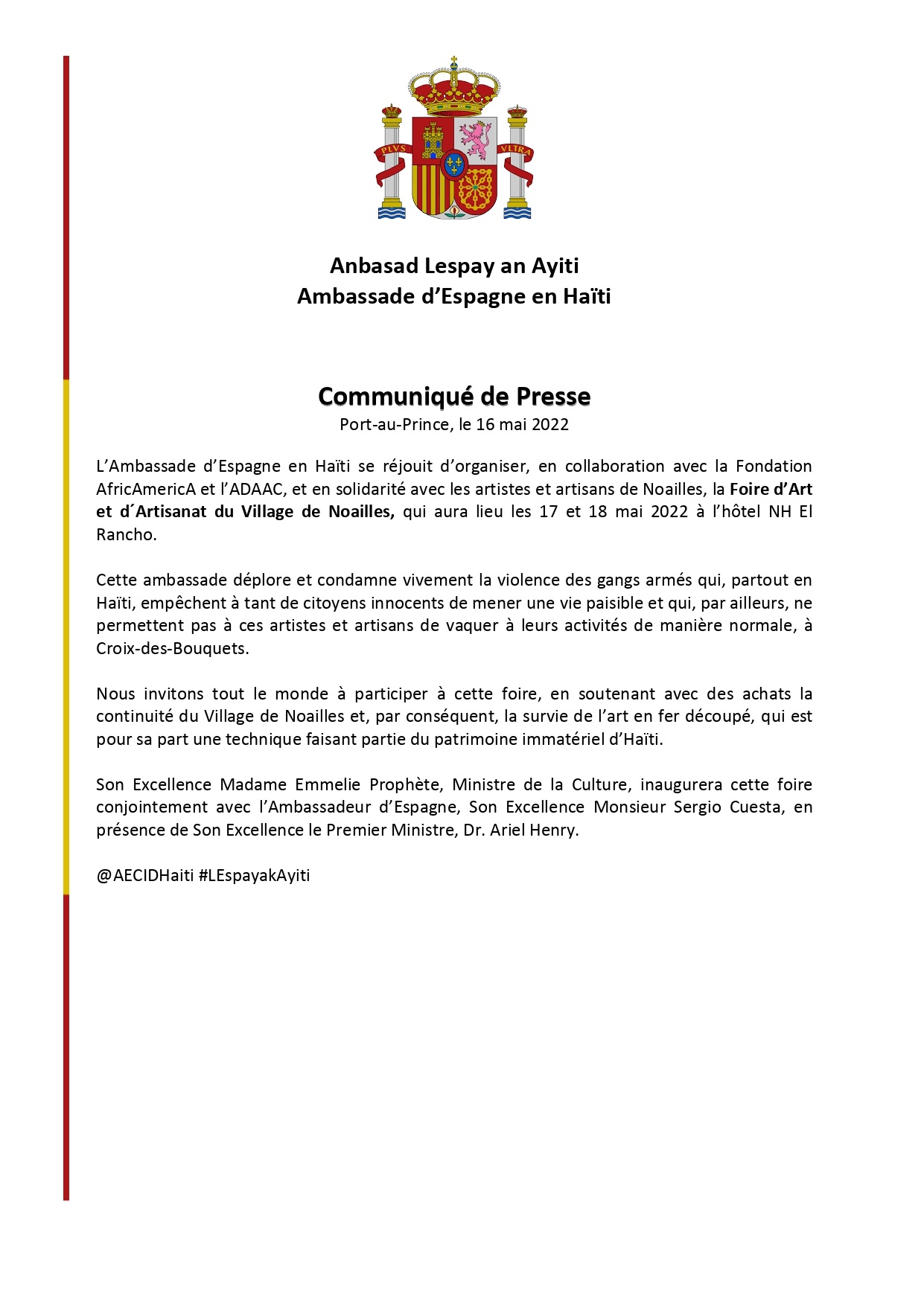 L’Ambassade d’Espagne en Haïti se réjouit d’organiser, en collaboration avec la Fondation AfricAmericA et l’ADAAC, et en solidarité avec les artistes et artisans de Noailles, la Foire d’Art et d´Artisanat du Village de Noailles, qui aura lieu les 17 et 18 mai 2022 à l’hôtel NH El Rancho.