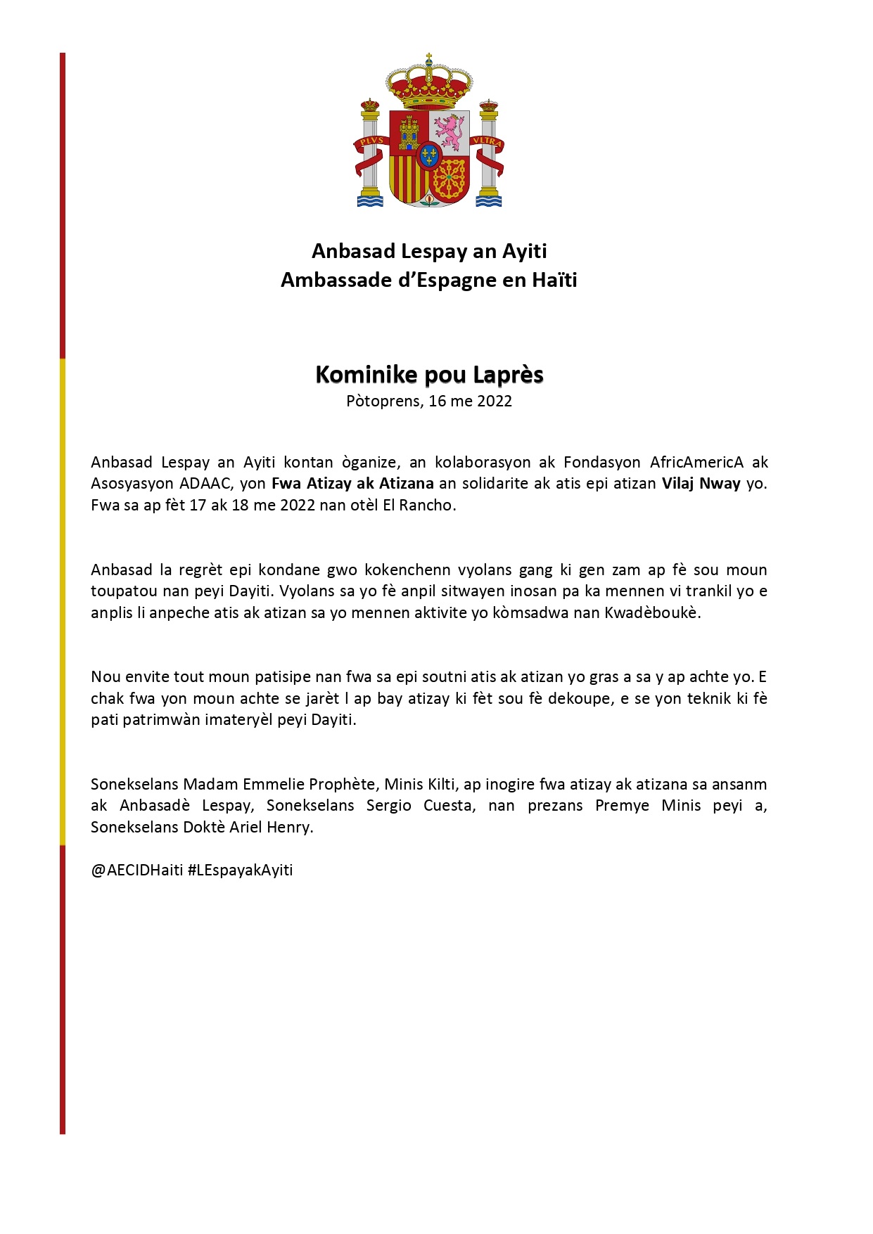 Anbasad Lespay an Ayiti kontan òganize, an kolaborasyon ak Fondasyon AfricAmericA ak Asosyasyon ADAAC, yon Fwa Atizay ak Atizana an solidarite ak atis epi atizan Vilaj Nway yo. Fwa sa ap fèt 17 ak 18 me 2022 nan otèl El Rancho.