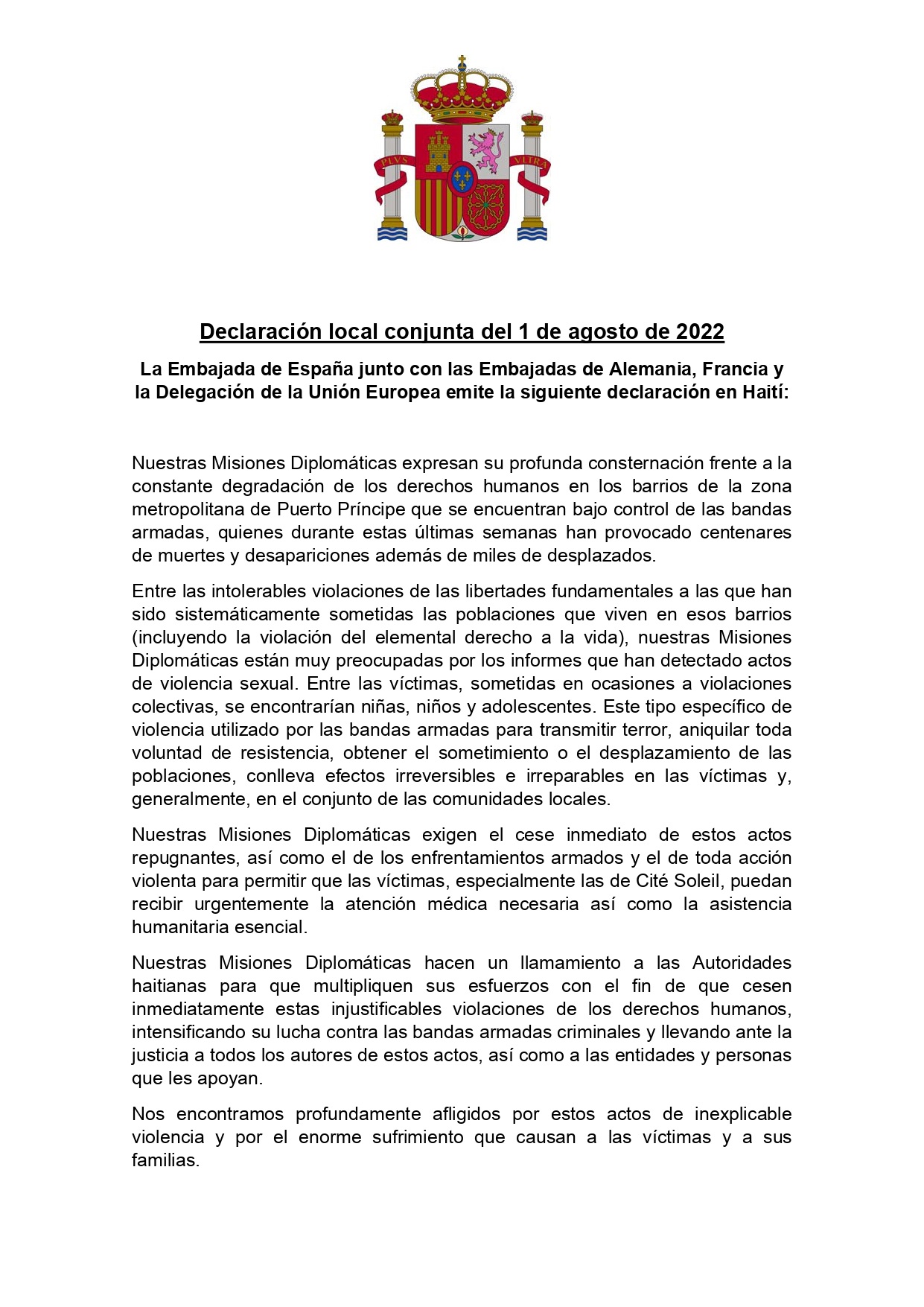 La embajada de España en Haití hace pública una declaración denunciando las inaceptables y sistemáticas violaciones de derechos humanos en Haití a manos de bandas armadas criminales, particularmente en Cité Soleil, y reclamando a todas las partes implicadas su inmediato cese.