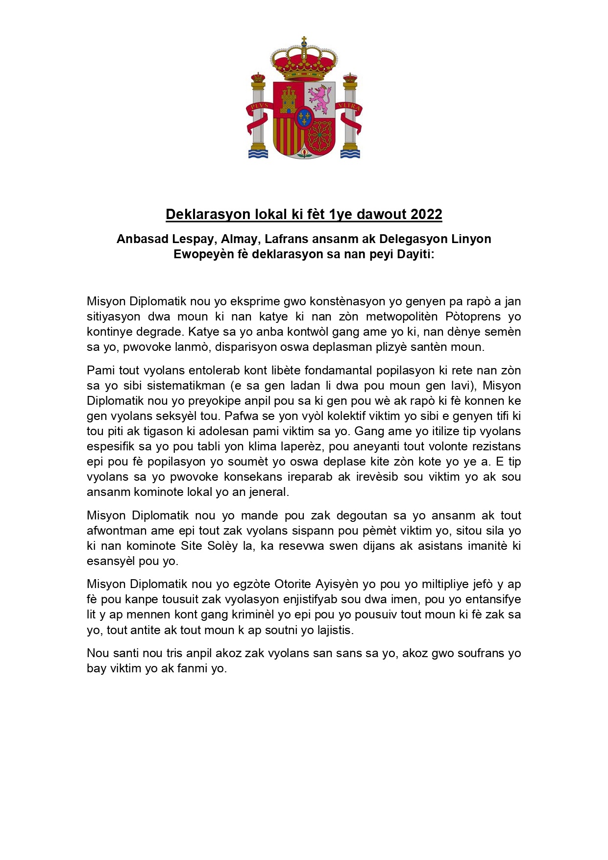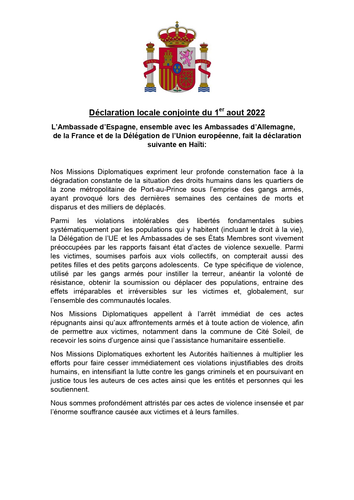 Anbasad Lespay an Ayiti rann piblik yon deklarasyon ki denonse vyolans inakseptab ak sistematik ki fèt pa rapò ak dwa moun ann Ayiti, anba kontwòl band ame kriminèl, patikilyèman nan Site Solèy, e reklame ke tout moun ki enplike nan vyolans sa yo sispann fè sa y ap fè a tousuit.