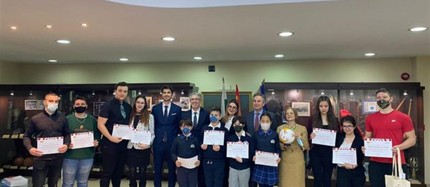 El Embajador de España Alejandro Polanco, junto con la Viceministra de Juventud y Deporte Diana Ivanova y el representante de LaLiga en Bulgaria Jesús Pizzaro, han entregado los premios a los ganadores del I Concurso Internacional Escolar de Cortometraje en español que, bajo el tema: “REDUCCIÓN DE LAS DESIGUALDADES MEDIANTE EL DEPORTE” ha organizado la Consejería De Educación En Bulgaria de esta Embajada de España con la colaboración de LaLiga de Futbol profesional de España.***Посланикът на Испания Алехандро Поланко заедно със заместник-министърът на младежта и спорта Диана Иванова и представителят на Ла Лига в България връчиха наградите на победителите в I Международен училищен конкурс за късометражен филм на испански език на тема: „НАМАЛЯВАНЕ НА НЕРАВЕНСТВАТА ЧРЕЗ СПОРТА”, организиран от отдел "Образование" на посолството на Испания съвместно с професионалната футболна лига на Испания.