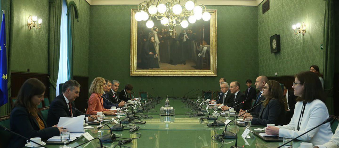 Encuentro de la Presidenta del Congreso de los Diputados, Meritzell Batet, con el Presidente de la República de Bulgaria, Rumen Radev, durante su visita institucional en España.