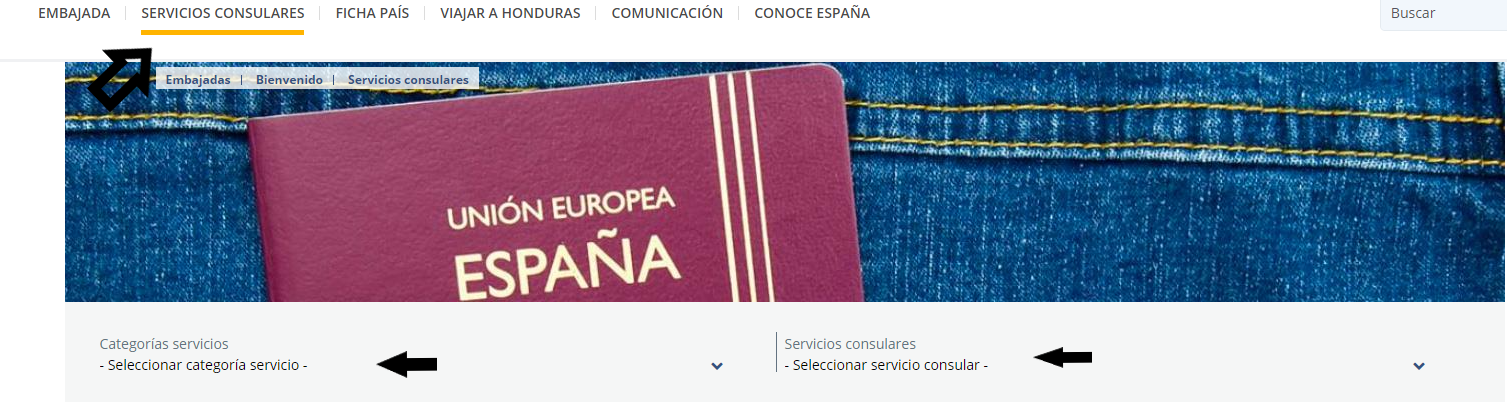 Tras la puesta en marcha de la nueva página web de la Embajada de España en Honduras, toda la información sobre visados se encuentra en la pestaña "Servicios consulares" en la página de inicio. Vea la imagen a continuación.