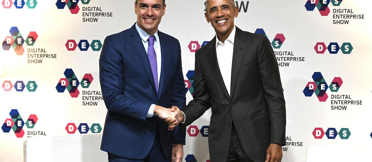 El presidente del Gobierno, Pedro Sánchez, saluda al expresidente de los Estados Unidos de América, Barack Obama. | Foto: Pool Moncloa/Borja Puig de la Bellacasa