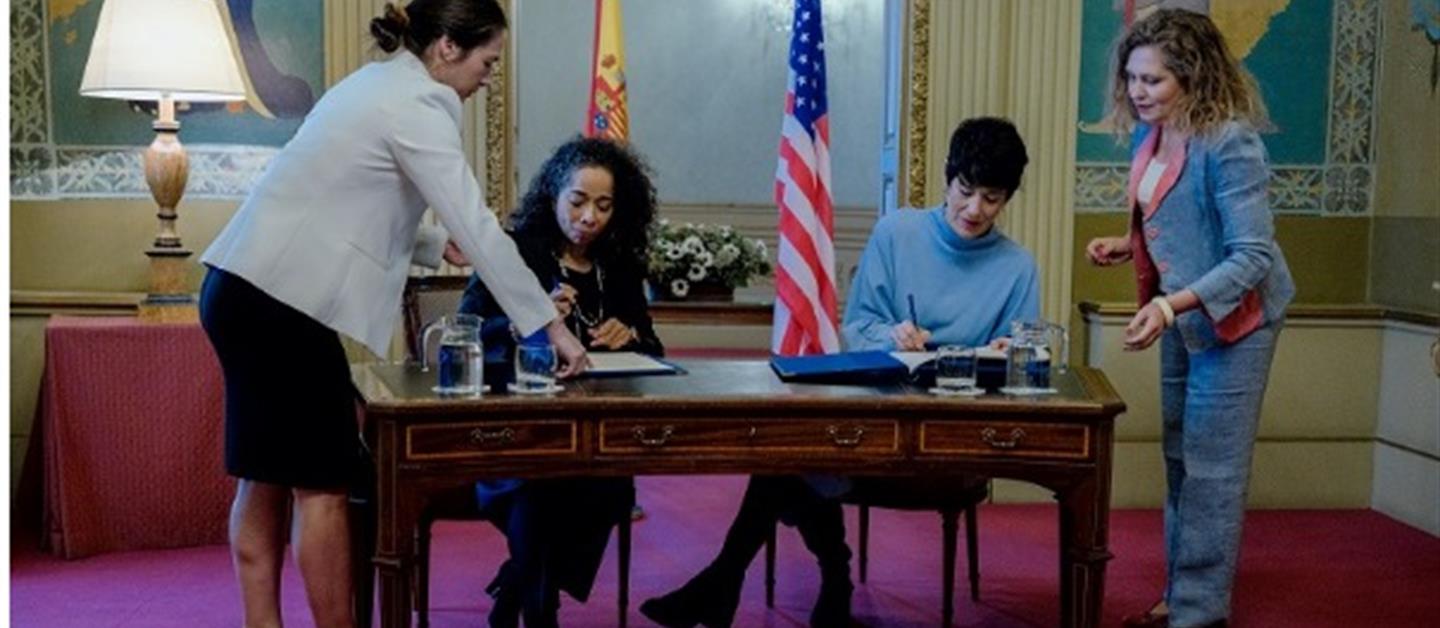 La ministra de Inclusión, Seguridad Social y Migraciones, Elma Saiz, y la embajadora de Estados Unidos en España, Julissa Reynoso, en representación del Gobierno de su país, han firmado hoy el Convenio de Seguridad Social entre España y EEUU que introduce mejoras en la protección social de los trabajadores que desarrollen parte de su vida laboral en ambos países.