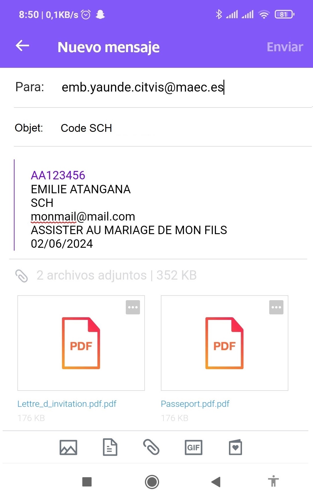 - Vous avez écrit par erreur à une adresse e-mail différente à celle –ci : emb.yaunde.citvis@maec.es