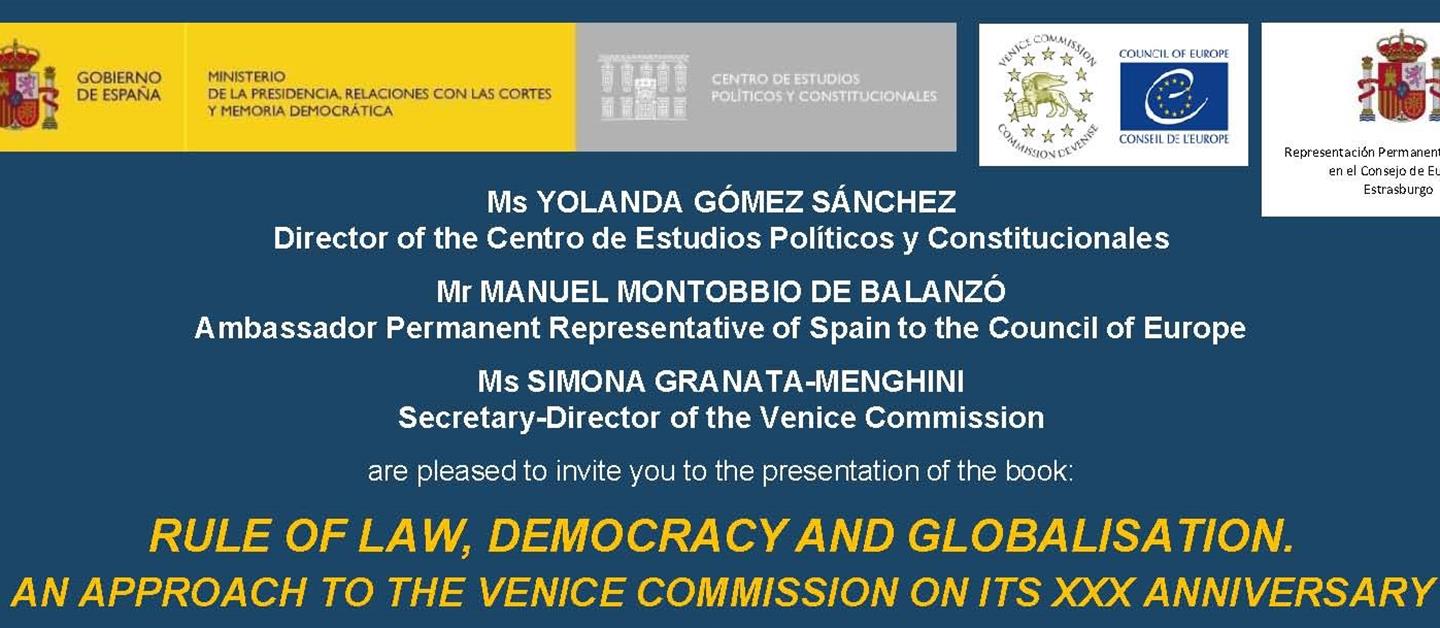 Lundi 24 octobre 2022 aura lieu au Centre d'Etudes Politiques et Constitutionnelles (Plaza de la Marina Española, 2, 28071, Madrid), la présentation du livre État de Droit, Démocratie et Mondialisation. Une approche de la Commission de Venise à l'occasion de son 30e anniversaire.