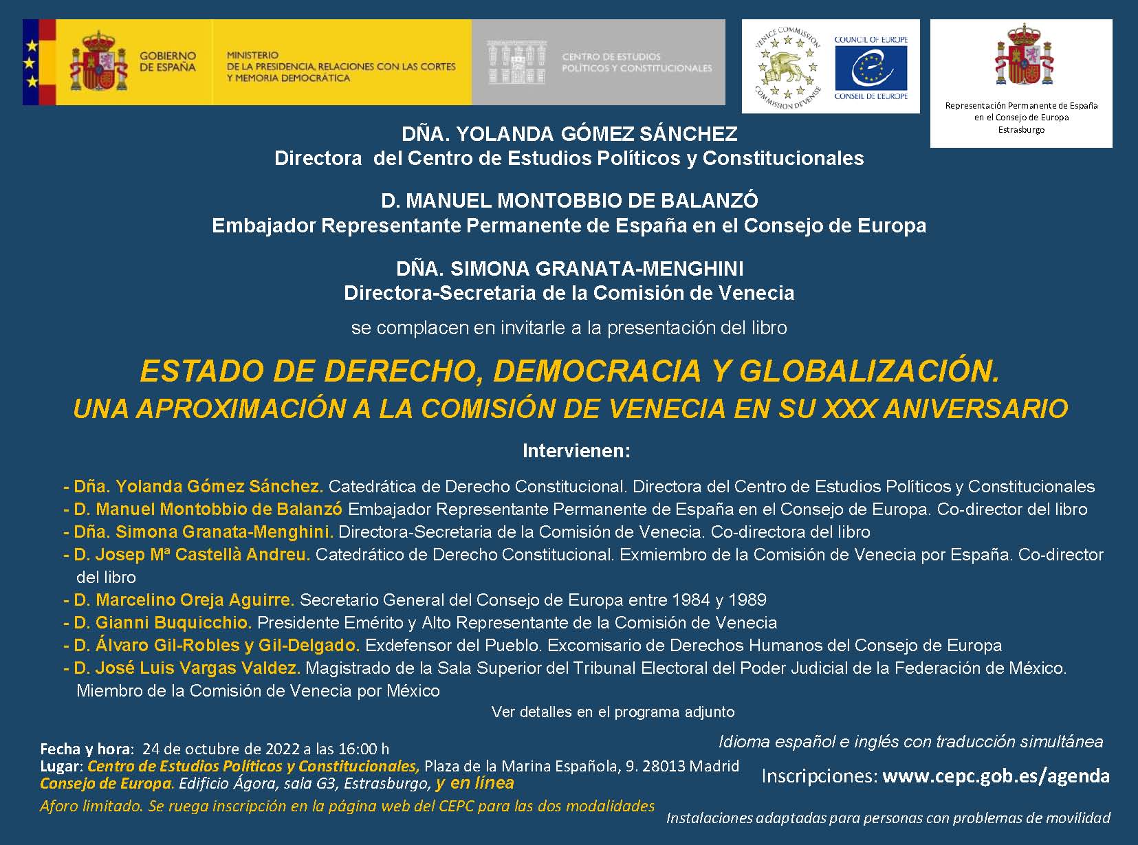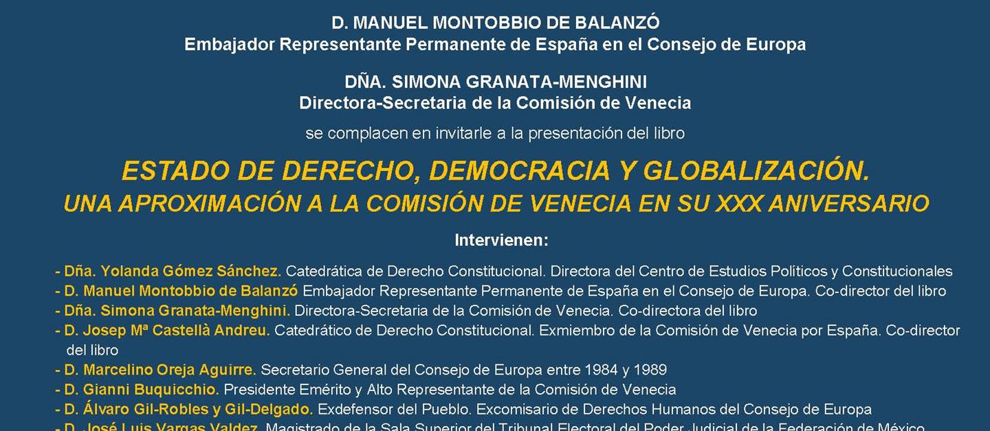 El lunes 24 de octubre 2022 tendrá lugar en el Centro de Estudios Políticos y Constitucionales (Plaza de la Marina Española, 2, 28071, Madrid) la presentación del libro Estado de Derecho, Democracia y Globalización. Una aproximación a la Comisión de Venecia en su XXX aniversario.