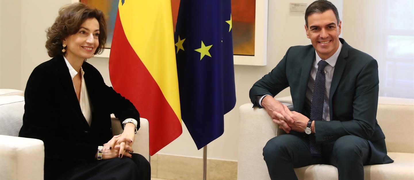 ● El presidente ha recibido en La Moncloa a la directora general de la UNESCO, Audrey Azoulay, para anunciar que Barcelona será la sede del principal encuentro internacional sobre políticas culturales.