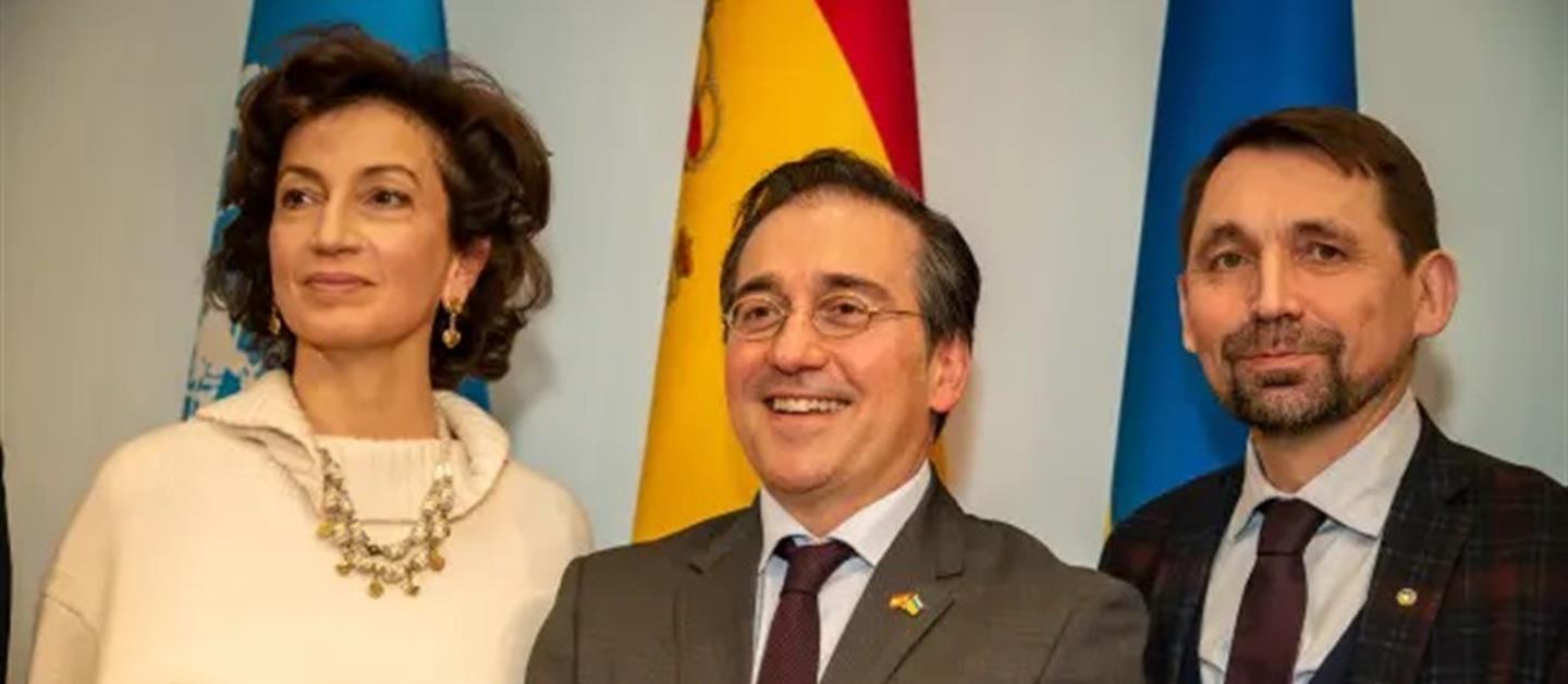 En esta línea, Albares inauguró un centro cultural creado gracias al Fondo Fiduciario España-UNESCO de Cooperación para el Desarrollo junto a su homólogo ucraniano, Andrii Sybiha, y a la directora general de la UNESCO, Audrey Azoulay. Este centro, financiado por la AECID, nace con el objetivo de crear un espacio dedicado específicamente a la cultura como factor de paz y resiliencia en el contexto bélico y posbélico en Ucrania, un país cuyo tejido productivo cultural ha perdido el 90% de sus recursos a causa de la guerra desencadenada por la invasión rusa.