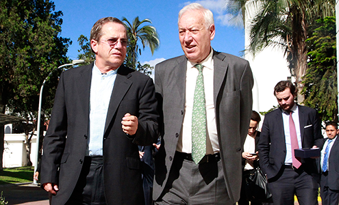 El ministro de Asuntos Exteriores y de Cooperación conversa con el ministro de defensa ecuatoriano, Ricardo Patrino. FOTO EFE.