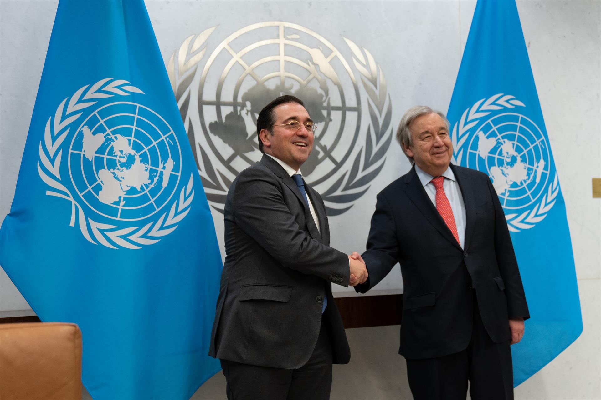 El ministre Albares amb el secretari general de l'ONU, António Guterres. EFE