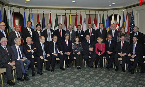 Foto de familia de los titulares de Asuntos Exteriores de países de la UE junto a la alta representante Catherine Ashton y John Kerry, secretario de Estado de EEUU. FOTO EFE.