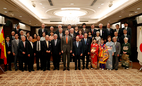 S.M. el Rey posa para la fotografía de familia durante la audiencia que mantuvo con personalidades japoneses vinculadas al hispanismo y a los estudios de lengua y cultura españolas. FOTO EFE.