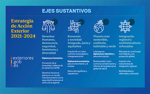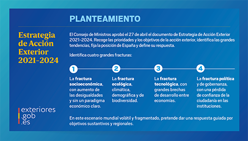 El Consejo de Ministros ha aprobado, en su reunión de 27 de abril, el documento de Estrategia de Acción Exterior 2021-2024, que recoge las prioridades y los objetivos de la acción exterior, identifica las grandes tendencias, fija la posición de España y define su respuesta.
